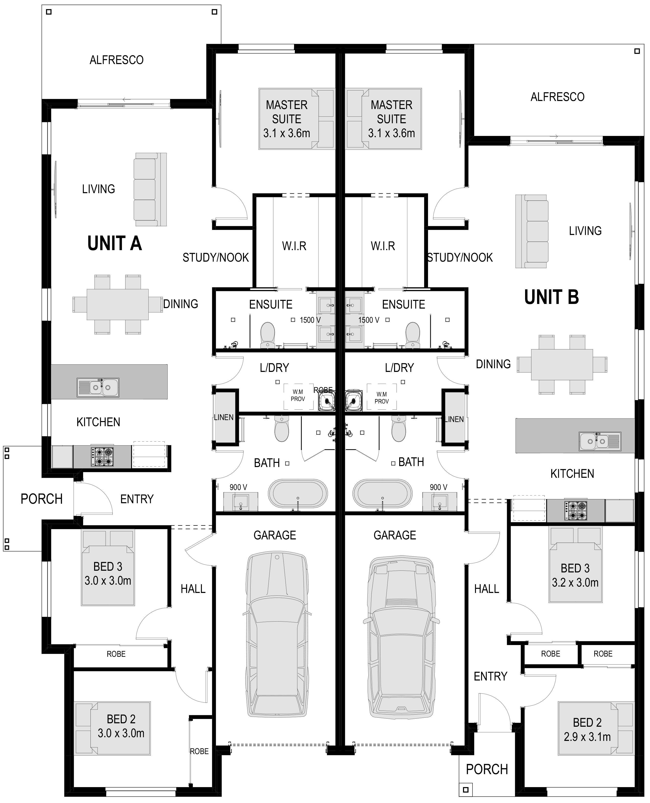 Ideal for corner lots, Derby offers a spacious duplex with pedestrian access from two roads. Each unit features 3 bedrooms, a study nook/workplace whilst the master bedroom located at the rear of the unit which includes a walk-in robe and ensuite with a double vanity, spacious laundry room and a modern kitchen with breakfast bar. Derby is the perfect choice for those seeking a comfortable and functional duplex on a corner lot.
